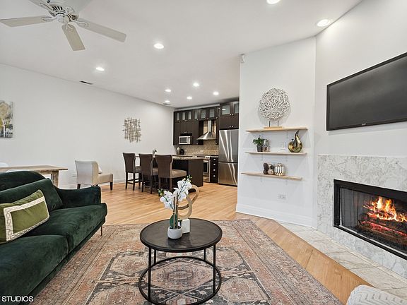 Incredible VALUE with this extra wide 3bed/2bath condo in West Town. Unit features freshly re-stained white oak hardwood floors throughout matched with a paint job top to bottom. As you enter, you instantly are taken back by the open concept, expansive living/dining room combo with 10ft ceilings, gas burning fireplace and huge front balcony for all of your entertaining needs. Great natural light at the front of the unit due to south facing exposure as well as adequate recessed lighting throughout the entire unit. Kitchen comes equipped with 54" walnut cabinetry, stainless steel appliances (brand new refrigerator in 2023 and new dishwasher in 2022), stainless vent hood, granite countertops, tile backsplash, under-mount sink with garbage disposal and large island with room to seat 3. Primary bedroom large enough for a king bed + a dresser and features a second balcony and huge walk-in closet with built-in organizers. Primary ensuite features a stand up shower, double vanity and a soaker tub. 2nd and 3rd bedrooms also great size to allow for 2 additional sleeping quarters or a work from home set up or even a nursery. Side by side washer and dryer, newer mechanicals and nest thermostat round out the unit. Don't forget about the common roof deck with skyline views and tandem parking for 2 cars behind the building included in the price. Self managed building. Steps to hot California Corridor, Ukrainian Village, Smith Park, Metra and public transit. Priced to sell!