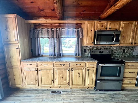 Welcoming log cabinFull walkout lower levelSpacious side deckRustic characterNewer appliancesExtra-large kitchenAbundant cabinetry