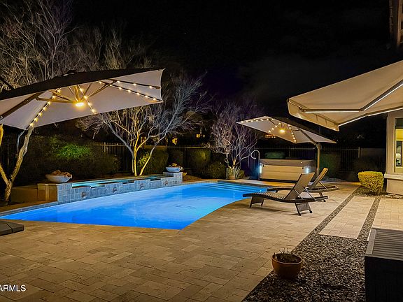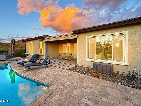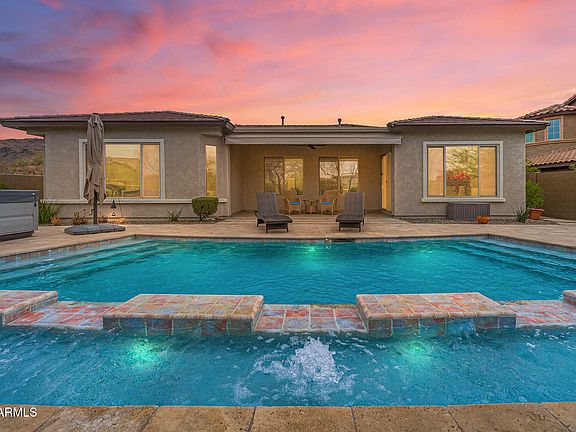 Welcome to this stunning former Pulte model home, perfectly positioned on a rare private lot in the highly desirable Fireside at Norterra community. Situated at the end of a secluded street, this home offers unparalleled privacy, backing to a scenic desert belt at the base of the breathtaking Sonoran Preserve. With the developer permanently deeding the adjacent land back to the city as a natural desert preserve, your serene mountain and desert views will remain untouched. Inside, this spacious 4-bedroom, 3.5-bath home is designed for both comfort and function, featuring 10-foot ceilings, a split floor plan, & a spacious greatroom. The primary suite is generously sized with a private offset bath, expansive walk-in shower, & a large walk-in closet. The secondary bedroom layout provides incredible flexibility. Two bedrooms each with walk-in closets are part of a private casita-style area with a full bath, a flex space/living area, & a separate entrance. The fourth bedroom, currently used as a theater room, can easily be converted back into a bedroom. A third full bath is shared between the two large secondary bedrooms w/ access to the flex space. The gourmet kitchen is a chef's dream, boasting KitchenAid stainless steel appliances, upgraded cabinets with pull outs, a huge pantry, & an oversized granite island. The eat-in kitchen offers plenty of space for casual dining, in addition to a separate formal dining room. Recent updates in 2023 include fresh interior and exterior paint, new Karastan carpet w/ a 25-year warranty, & upgraded shade screens along the back of the home. Step outside to your backyard oasis, where travertine pavers lead you to a resort-style pool with a stunning water feature. The covered patio is enhanced with a motorized retractable sunshade & a full roll-down shade, creating the perfect space to relax & take in the breathtaking sunset views. As a resident of Fireside at Norterra, you'll have access to top-tier amenities, including, state-of-the-art fitness center with a steam room, tennis courts, miles of hiking & biking trails, paved walking paths throughout the community, a heated resort-style pool & spa and convenient access to premier shopping & dining at The Shops at Norterra. This one-of-a-kind property offers an unbeatable combination of privacy, luxury, and convenience. Don't miss this rare opportunity to own a home in one of the most sought-after locations in Fireside at Norterra!