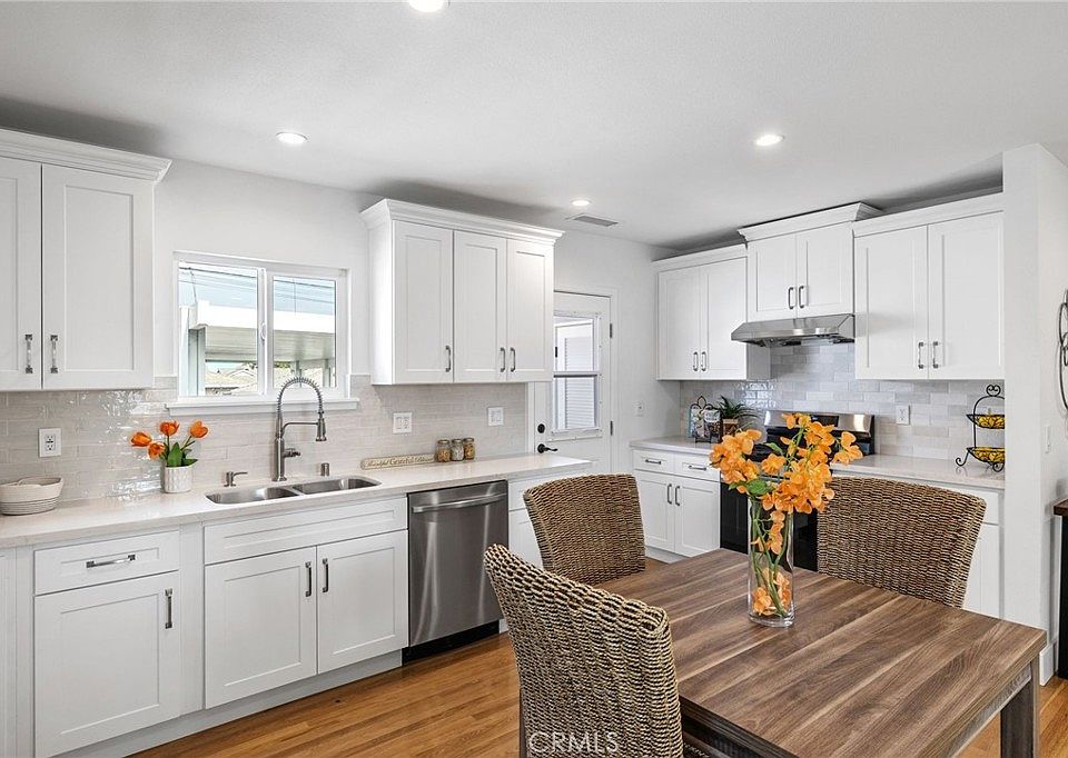 El Nido neighborhood, close to 405, shopping, schools, parks and the Friendship Campus. Full systems and cosmetic remodel, we call it NEW RECONSTRUCTION when the cosmetics are updated in addition to new systems such as new energy efficient windows, two new electrical meters, new electrical wiring, new PEX and copper plumbing, new ABS drain lines and updated sewer line into front yard. Before you buy a remodel, confirm its a NEW RECONSTRUCTION, and not just cosmetic remodel with the tired old systems. Two bedroom Two bath home PLUS garage converted to studio apartment, an additional dwelling unit, plus a big covered patio and back yard. Oversized, Overwide brand-new, steel reinforced concrete driveway for off street parking in front of gated and fenced back yard. Open floor plan with lots of kitchen counter space and plenty of storage in cabinetry. New lawn and garden irrigation system in front and back yards. Designer touches in the kitchen backsplash, bathrooms and showers. Exhaust fans in the bathrooms and in the stacked laundry closet. Main house features old school narrow plank hardwood floor, refinished into a natural white oak soft satin finish. Additional dwelling unit features a full kitchen and new wide plank white oak flooring. Both kitchens include a full suite of appliances.