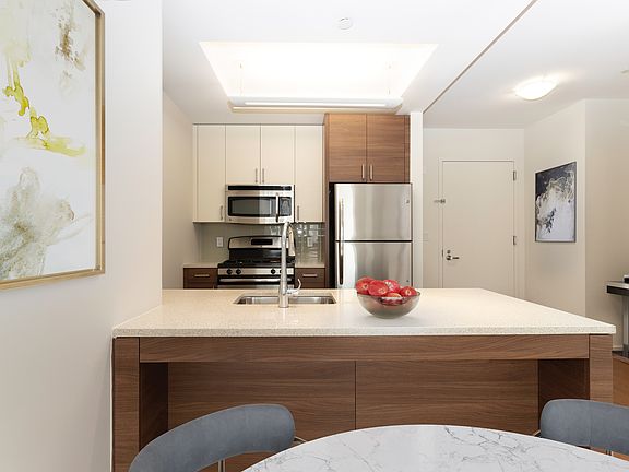 Step into thoughtfully designed spaces that blend form and function. Each apartment features floor-to-ceiling windows, immersing you in the beauty of the Manhattan skyline. The kitchens are culinary havens, complete with GE stainless steel appliances, custom walnut and glass cabinetry, and sleek white-speckled quartz countertops. Bedrooms offer generous space and oversized closets for all your essentials, while bathrooms impress with glass-enclosed tubs, premium Kohler fixtures, and chic wood vanities.