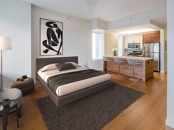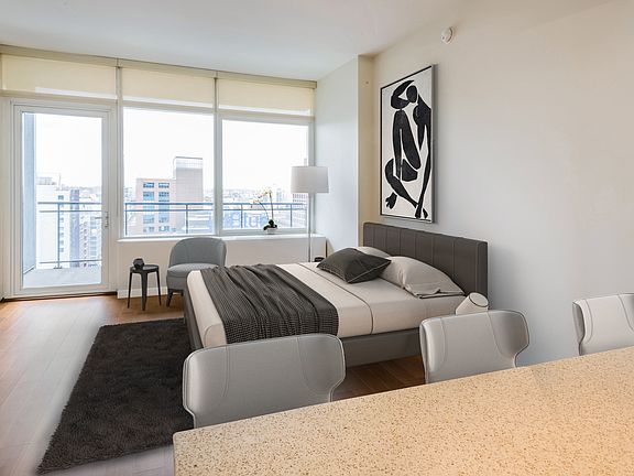 Step into thoughtfully designed spaces that blend form and function. Each apartment features floor-to-ceiling windows, immersing you in the beauty of the Manhattan skyline. The kitchens are culinary havens, complete with GE stainless steel appliances, custom walnut and glass cabinetry, and sleek white-speckled quartz countertops. Bedrooms offer generous space and oversized closets for all your essentials, while bathrooms impress with glass-enclosed tubs, premium Kohler fixtures, and chic wood vanities.