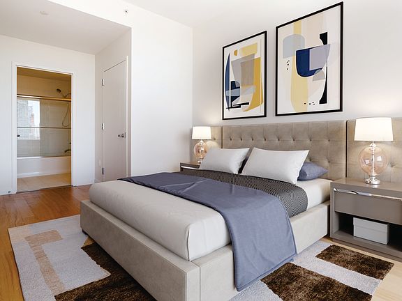 Step into thoughtfully designed spaces that blend form and function. Each apartment features floor-to-ceiling windows, immersing you in the beauty of the Manhattan skyline. The kitchens are culinary havens, complete with GE stainless steel appliances, custom walnut and glass cabinetry, and sleek white-speckled quartz countertops. Bedrooms offer generous space and oversized closets for all your essentials, while bathrooms impress with glass-enclosed tubs, premium Kohler fixtures, and chic wood vanities.