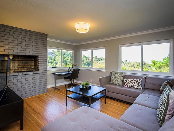 Designer remodel from top to bottom. Stunning views of the East Bay and beyond, 2 large decks + huge sport court on more than one-quarter acre. Open concept floor plan w/ stunning gourmet kitchen, stainless steel appliances, fireplace and separate office/play room. 3 main-level bedrooms include master suite w/ spa-like bath + 2 lower-level beds and large recreation room. Newer solar panels. Peaceful & tranquil close to hiking trails yet minutes to shopping/dining & midway between SF & Silicon Valley.