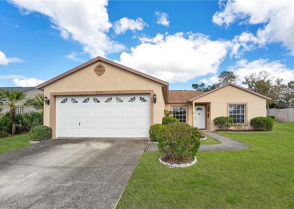 Location, location, location. Welcome to 2703 Leafy Way. This desirable split plan offers 3 bedrooms and 2 full baths. Exterior construction is block and stucco. The kitchen is nice and bright and has an eat in area with a new sink. Ceramic tile in the main areas of the home. Master bath offers a garden tub with separate shower. The backyard will not disappoint. There is a patio for entertaining and it is nicely landscaped and partially fenced. Washer and Dryer stay! Only a short distance to the Deltona Library, Lyonia Environmental Center, Epic Movie Theater and the new AMAZON distribution center. Need to commute? This home is only a 5 minute drive to I-4. Currently zoned for Deltona High School. Go Wolves!