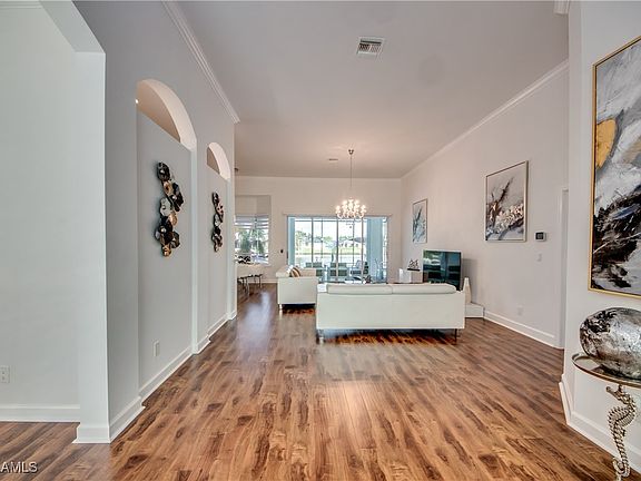 Welcome to your dream home—an exquisite Gulf access property located directly across from the new and popular Sands Park in Southwest Cape Coral. This stunning property, recently remodeled and updated, boasts 3 spacious bedrooms, 2 luxurious bathrooms, plus a DEN, all thoughtfully designed within over 2,200 square feet of elegant living space. The open-concept layout enhances the flow of the home, perfect for both entertaining and everyday living. Every corner reflects meticulous attention to detail, featuring a grand foyer that leads into a bright, expansive living area complemented by formal dining options and a cozy breakfast nook. The gourmet kitchen is a true chef’s delight, equipped with upgraded appliances, level 5 granite countertops, chic kitchen hardware, and a tasteful matching backsplash that highlights the modern design. The master bedroom offers ample space that can accommodate a vanity or a cozy sitting area, perfect for unwinding after a long day. The bathroom en suite has been upgraded to reflect modern elegance, featuring double sinks and exquisite quartz countertops. The frameless glass shower is a standout, showcasing beautiful tile work and is equipped with linear drains for a seamless look. Adding to the convenience and luxury are the smart water closets. Throughout the main living area and bedrooms, engineered wood floors create a warm and inviting atmosphere, seamlessly blending style and durability. Stepping outside, the expansive outdoor area beckons with a huge lanai and a heated pool, perfect for entertaining friends and family. An outdoor kitchen with a built-in grill, wine cooler, and bar sink enhances the outdoor experience, making it an ideal space for gatherings. For boating enthusiasts, this home comes with a remarkable boat dock (PVC) featuring a sitting area with a canopy and a 10,000 lb lift, allowing for easy access to the Gulf. The property was professionally furnished and decorated, providing a turn-key opportunity for buyers. Don’t forget to check out the virtual tour to experience the full splendor of this exquisite home!