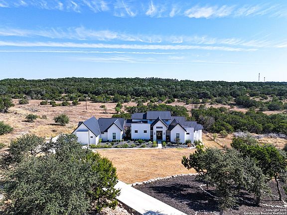 Breathtaking contemporary single-story with 4 beds, 3.5 baths, and 3873 sq ft situated on 1.44 acres in the coveted, gated subdivision of Ramble Ridge! Nestled amongst picturesque hills, the stately driveway leads you to the captivating front entrance. Upon entering, the 20ft high ceilings and custom beams commands your attention for the great room with fireplace and a wall of windows. The gourmet entertainer's kitchen is outfitted with Jenn Air appliances, stunning quartz countertops, designer fixtures, and soft-close cabinetry. No detail has been spared with the pantry that looks straight out of the Home Edit - with an on-trend custom paint, custom cabinetry. Don't miss the designer bar space, a great focal point off the kitchen. The flex space off the living room is used as a media room but can also be a formal dining space. The luxurious primary bedroom features scenic views with total privacy and connects to a spa-like ensuite with a large walk-in shower, dual water closets, a modern free-standing tub, and your dual dream closets! Off the primary suite wing, you will also find an additional space that can be used as a study, a nursery, or workout space. The secondary bedrooms have ensuite baths and high ceilings. Storage space abounds with an expansive laundry room and spacious 3 car garage with electric vehicle charging outlet, cabinetry, and a sports storage wall. Enjoy the Texas Hill Country evenings on the grand back patio, perfect for relaxing and entertaining! With a ranch behind your lot, you have unmatched privacy and views!! Dual Solaris units for indoor air quality; new water softener & osmosis system; Comal ISD. Welcome home!