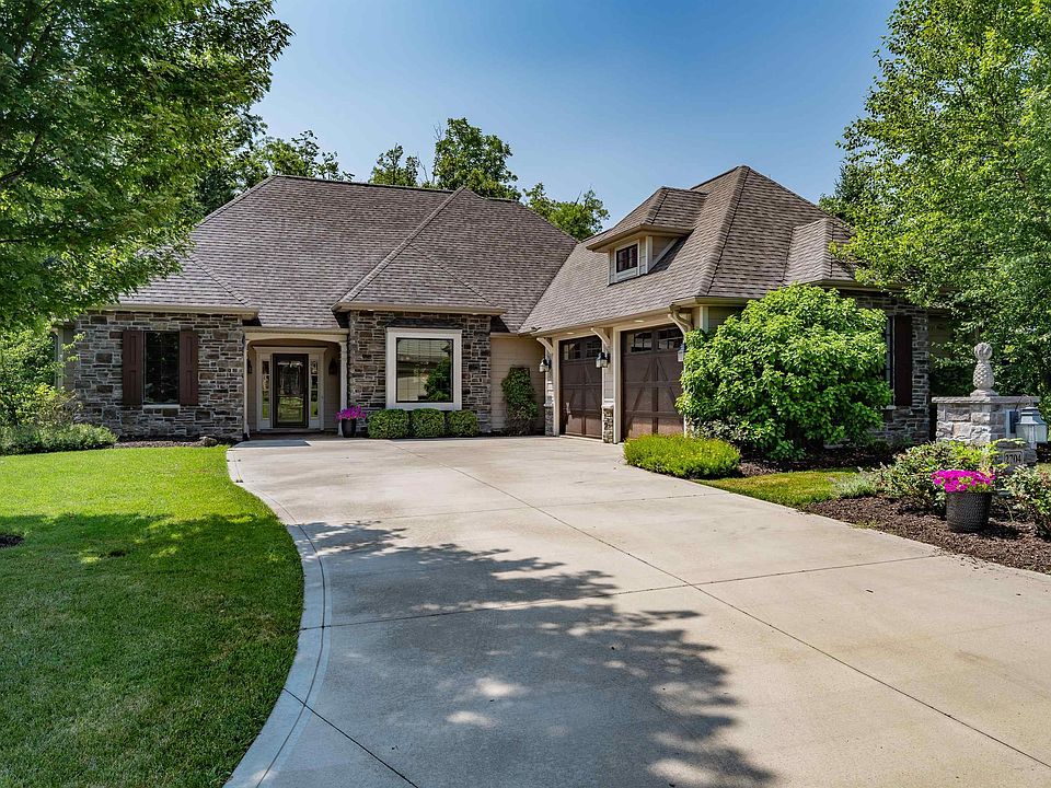 Welcome to this stunning, custom-built 4-bedroom, 3-bath villa nestled in the prestigious Parke community, offering refined design and low-maintenance living. Tucked away on a peaceful cul-de-sac, this thoughtfully curated home showcases high-end finishes throughout, including rich hardwood flooring, crown molding, custom built-ins, and a flowing open-concept layout. The elegant great room is a true showpiece, featuring a tray ceiling, cozy fireplace, and double French doors that open to a private, tree-lined backyard. Entertain effortlessly in the open dining area and chef-inspired kitchen, complete with a large center island, gleaming quartz countertops, designer backsplash, stainless steel appliances, dual wall ovens, and a spacious walk-in pantry. The luxurious main-level primary suite is generously sized and bathed in natural light, offering a spa-like en-suite bath with quartz-topped dual vanities, double closets, and a custom-tiled walk-in shower. A second main-level bedroom provides ideal flexibility as a guest room, home office, or den. A custom built-in locker space adds stylish function just off the hallway leading to the upper level. Upstairs, you’ll find two additional spacious bedrooms, a versatile loft area, and a full bath—perfect for family or visiting guests. Enjoy peaceful outdoor living on the stamped concrete covered patio surrounded by lush landscaping and a wooded backdrop. This villa offers true lock-and-leave convenience with dues that include lawn care, mulching, and snow removal. Perfectly located with easy access to I-69, Lutheran Hospital, schools, shopping, dining, and scenic walking trails—this exceptional home offers both luxury and lifestyle.