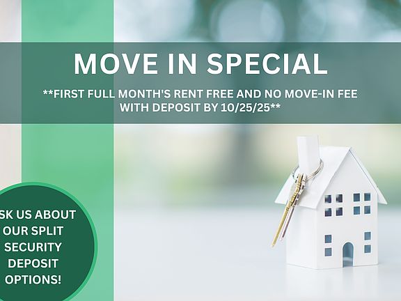 - Special offer! **FIRST FULL MONTH'S RENT FREE AND NO MOVE-IN FEE WITH DEPOSIT BY 10/25/25** **SPLIT THE PAYMENT! Reserve your new home by paying 50% of your security deposit now, with the remaining balance due before move-in.**