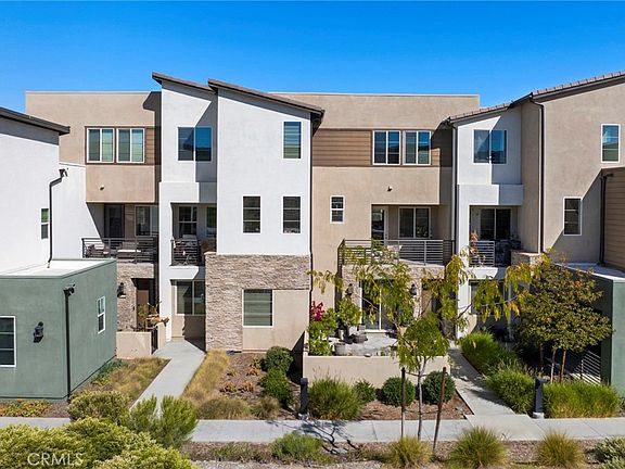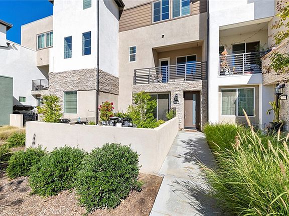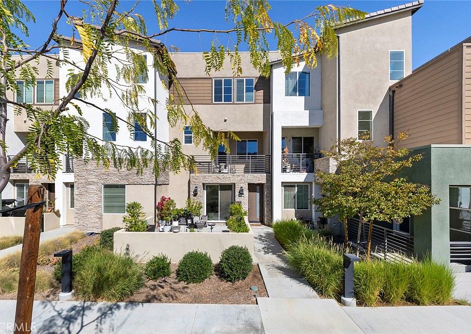 An amazing tri-level, stacked flat concept home Featuring a modern and functional layout with a spacious ground level office space perfect for working from home. The main level features an open concept design, showcasing luxury vinyl waterproof flooring, a bright family room with its own private balcony, LED lighting, a dining area, and a beautiful kitchen complete with sleek white cabinetry, stainless steel appliances, and quartz countertops. A Half bath is located on main level. Upstairs, you'll find two roomy bedrooms, each with its own full bathroom, along with a convenient laundry area. The 2-car garage is attached with direct access to unit and offers a tankless water heater. Includes front yard private patio area. Enjoy some of the BEST HOA amenities around, including resort-style pools, a kiddie pool, a community center, outdoor fire pit with plenty of seating, picnic areas, cooking stations, community gardens, dog stations, and scenic walking trails. Centrally located near award-winning schools, golf courses, shopping at Westfield Mall, Six Flags Magic Mountain, and with easy freeway access. Come for a visit. Stay for a lifetime. Welcome home!