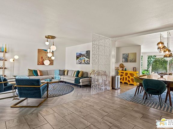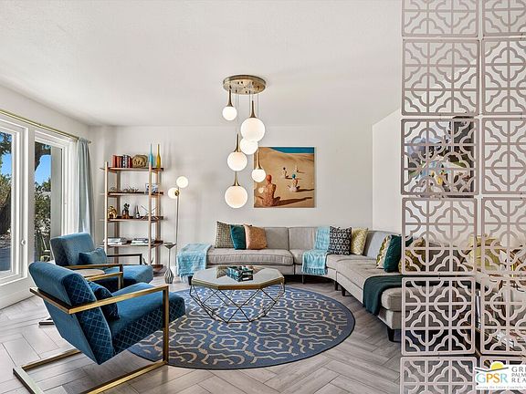 Experience the perfect blend of style and comfort at the 'Maison Bleu'. This beautifully styled home features four spacious bedrooms and two modern bathrooms, spread across 1,584 sf of smartly designed living space, all set on a generous 1/4 acre corner lot. The home offers stunning, unobstructed mountain views from the expansive private backyard. Inside, the kitchen shines with granite countertops, gas range and stainless appliances, connected to a chic dining area. The spacious great room and additional den offer plenty of entertaining space and separation, enhancing the bright and airy feel. Four custom-wallpapered bedrooms allow plenty of room for sharing with friends and family. Enjoy modern amenities such as a Nest thermostat, a security system, and keyless entry. Enhancements also include updated dual-pane windows and a recently installed roof, ensuring peace of mind and energy efficiency. Outside, experience resort-style amenities with a sparkling pool, expansive outdoor kitchen and bar, poolside cabana, bocce court and plenty of lounging space for soaking up the sun. A private patio and spa off of the primary offers solitude under the charm of a mature olive tree. The property also features a two car garage with laundry, and plenty of parking. This home is the epitome of modern Palm Springs living, offering architecture, comfort and breathtaking scenery in a vibrant community. Furnishings available.