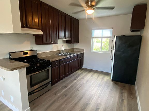 Stainless steel double-bowl sinkCherry-wood cabinetsSliding closet doorsGas stoveCeiling fans