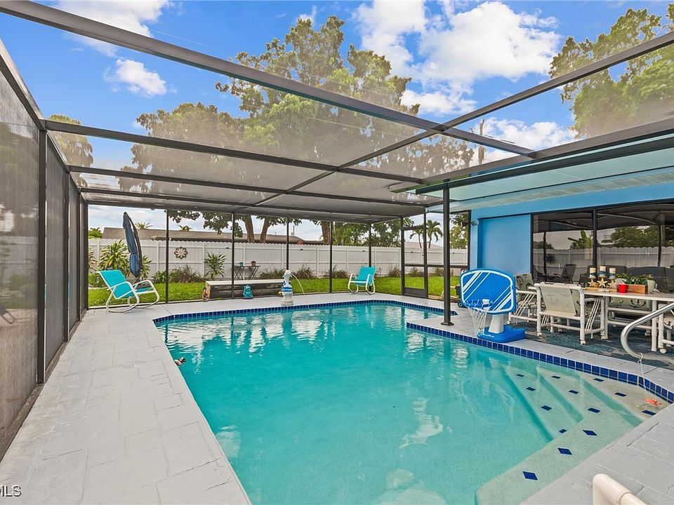 The sliding door to the lanai rolls completely out of the way, seamlessly blending indoor and outdoor living. The lanai offers a large covered area, while the pool features a water fountain and is fully enclosed with a new cage. The fenced backyard is like an oasis with mature landscaping and tropical plants, and there is patio space on both sides of the home, perfect for entertaining.