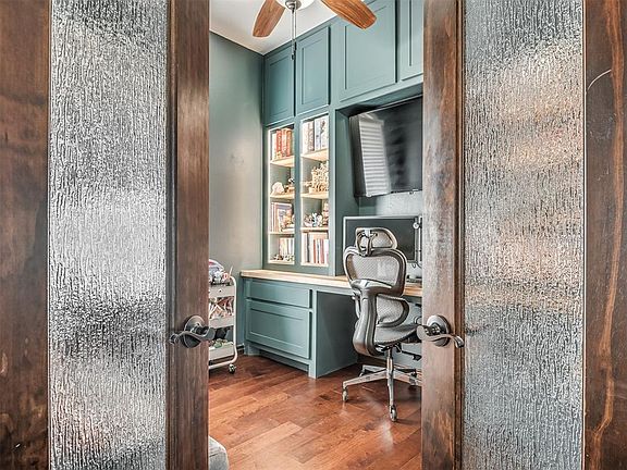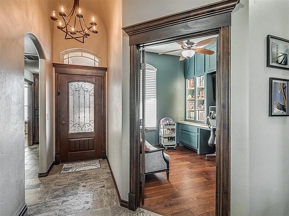 Welcome to this beautifully maintained three-bedroom, two-bathroom home that also includes a dedicated study, located in the Moore School District. From the moment you step onto the charming covered front porch, you’ll appreciate the thoughtful upgrades and custom touches throughout. The study features custom backlit bookshelves and a built-in desk, while one of the secondary bedrooms includes a built-in bunk bed that can be removed if not needed—ideal for flexibility. The chef’s kitchen boasts an oversized island, premium appliances, a wine fridge, and a second convection oven that doubles as a microwave. The walk-in pantry is outfitted with floor-to-ceiling shelving, maximizing storage space. Hardwood floors extend through the living room, study, and primary bedroom, adding warmth and elegance. The primary bedroom has a tray ceiling and en suite bathroom with double vanity, jetted tub and walk in shower. The oversized walk-in closet features built in dressers and plenty of storage space. There is also a dedicated door that whisks you to your backyard paradise.