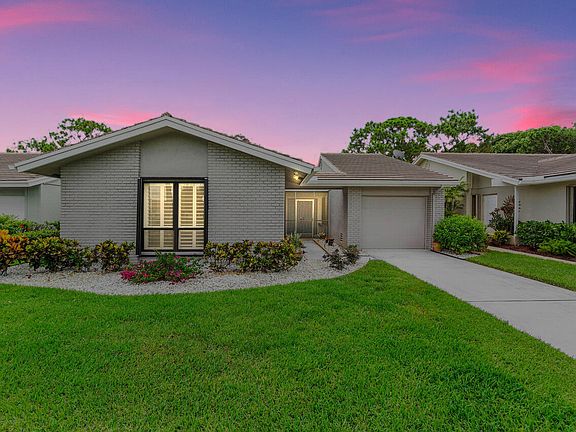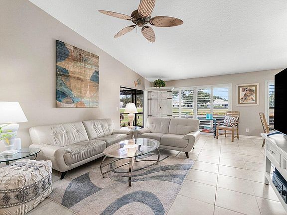 Enjoy 1-story living w/ gorgeous open views of the 17th fairway! CBS home w/ a combo of hurricane impact windows and Accordian shutters for easy breezy storm prep! Lovingly cared for and move-in ready. If you like a large living area and open, soaring ceilings - this one is for you! Double door entry greets with grandeur and makes moving simple. Light and bright with Southeastern views. Thoughtfully remodeled to include a new kitchen w/ white shaker style cabinetry, granite counters, stone backsplash & newer appliances including a Bosch dishwasher and 2025 refrigerator. Breakfast bar and dining area perfectly suit entertaining or meals for one. Floors have new tile throughout - no carpet! Bathrooms have also been updated w/ new vanities, new shower tile and glass enclosures. Primary bedroom tucked away from the other two secondary bedrooms. Plantation Shutters | AC 2016 | Water Heater 2024 | Garage Door 2022 | Impact Windows(partial) 2020 | Accordian Shutters(partial) 2024. Enjoy the Florida lifestyle on your covered & screened lanai with roll-down awnings for privacy. Green space is endless with golf course views but on a quiet stretch of fairway.