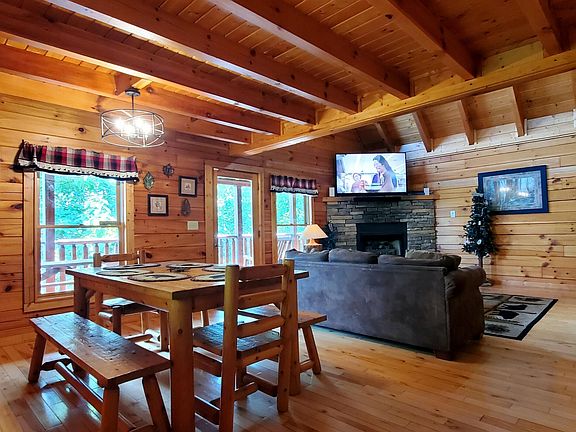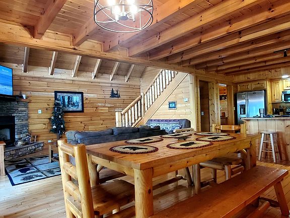 The spacious open-concept living, dining, and kitchen area provides ample room for family gatherings, while the hot tub on the lower deck offers a peaceful spot to unwind after a day of exploring. This authentic log cabin, crafted entirely of wood inside and out, offers an unparalleled Smoky Mountain experience. No sheetrock here—just genuine logs, creating a warm, rustic atmosphere throughout.