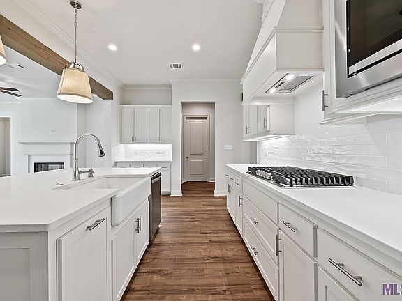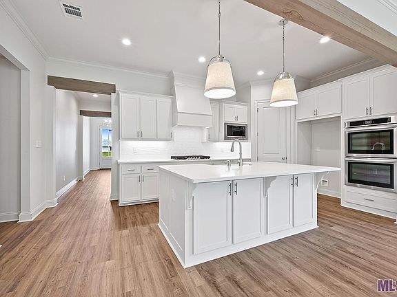 The “Huron’’ plan is a one story spacious and open floor plan with over 2400 sq feet. You will enter the home off of the wrapped L shaped porch with stately columns and a hanging gas lantern. Once inside you will enter the large foyer which leads to beds 3 and 4 at the front of the home and then into the open living, kitchen and dining which all overlook the covered rear porch and backyard. The gourmet kitchen features custom painted cabinets, large center island with sink, hanging pendants, stainless appliances including a gas cooktop, single wall oven and built in microwave, 3cm granite countertops and a walk in corner pantry. The master suite is located at the rear of the home for privacy and features a HUGE master closet and a spa like master bath with dual vanities, separate soaking tub and custom tiled shower and framed mirrors. Bedrooms three and four share a hall bathroom and bedroom two has a separate bath off the hallway. The yard will be professionally landscaped and fully sodded! THIS IS PROPOSED CONSTRUCTION THAT CAN BE BUILT WITHIN 6 MONTHS FROM THE TIME OF CONTRACT, BUYER CAN CUSTOMIZE THE HOME AT THE BUILDERS' DESIGN CENTER. Water's Edge is located along Nicholson Drive, south of Bluebonnet Boulevard and is tucked inside the well established community, Lexington Estates. Water's Edge is a private gated community and offers easy access to shopping, dining, and entertainment with luxury features and access to lakes, green spaces, and a resort-style community pool & Cabana. *Pictures are not of the actual home but are of the same floorplan.