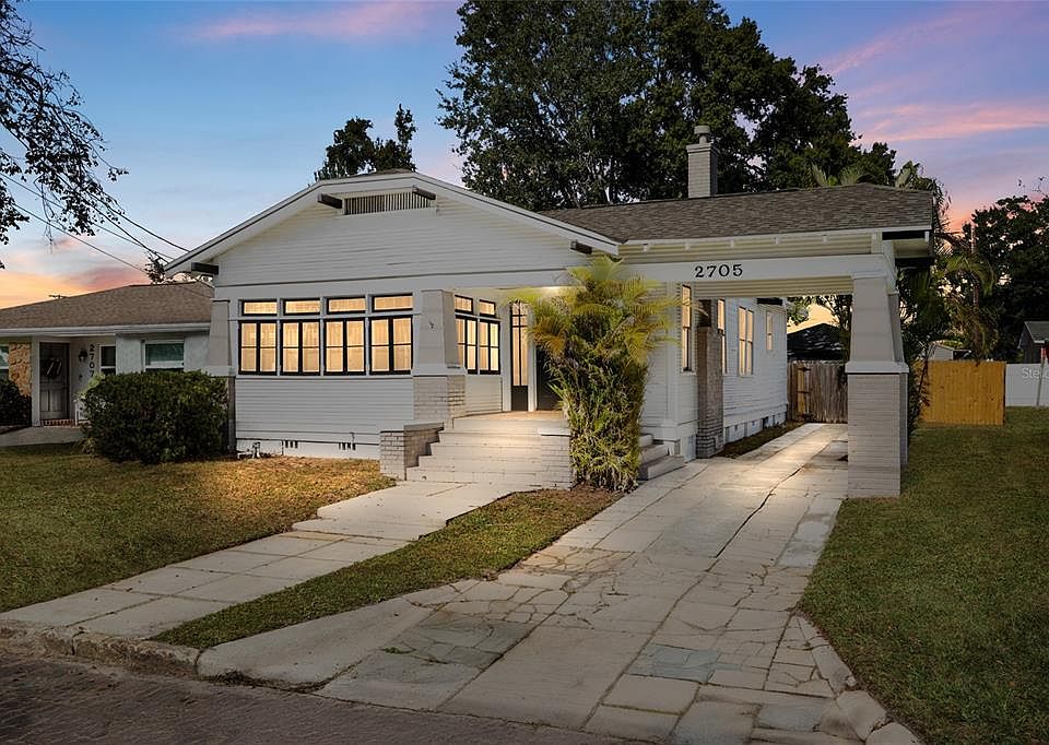 Step into the charm of a 1920s West Tampa bungalow that blends historic details with modern updates. With 10-foot ceilings, original windows framed in period moldings, an iconic attached portico, plaster walls, crown molding, and a cozy wood-burning fireplace, the home captures everything people love about true bungalows. You’ll also enjoy new flooring, a beautifully updated kitchen with granite counters, solid wood cabinetry, stainless appliances, and a built-in breakfast nook. The layout offers three bedrooms, two baths including a primary ensuite, a light-filled bonus room, indoor laundry, and a fully fenced backyard perfect for relaxing or entertaining. Major updates: 2022 roof, 2023 HVAC, updated plumbing and electrical and an electric tankless water heater giving you modern updates where it counts most. Directly across from a park and playground and minutes to I-275, Ray Jay, Armature Works, Tampa Airport, Downtown, Midtown, the food scene and local restaurants, this home sits in one of Tampa’s most convenient and growing neighborhoods. Floor plan available.
