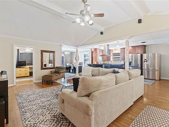 Welcome to a blend of timeless elegance and comfortable family living. This beautifully appointed 4-bedroom, 3-bathroom home captures the essence of Southern charm from the moment you arrive, greeted by a magnificent covered front porch that spans the entire length of the home—a great spot for relaxing evenings and friendly conversation. Step inside to be welcomed by an inviting interior featuring gleaming hardwood floors and a spacious, open floor plan. The grandeur begins with a vaulted ceiling that creates an airy and expansive atmosphere. A formal dining room provides a setting for holiday gatherings and special occasions, while the heart of the home is the large, well-appointed kitchen. It boasts a generous central island, premium stainless-steel appliances, and ample counter space, making meal preparation a joy. Retire to the luxurious primary suite, a true private retreat complete with a spacious walk-in closet and a large, well-appointed bathroom. The home’s thoughtful layout includes three additional bedrooms, a versatile bonus flex room great for a media center, playroom, or gym, and a dedicated office area to accommodate today’s work-from-home needs. Nestled in a prime location, this property offers unparalleled convenience with a plethora of restaurants and shopping options just moments away. Buyer to verify all information during due diligence.