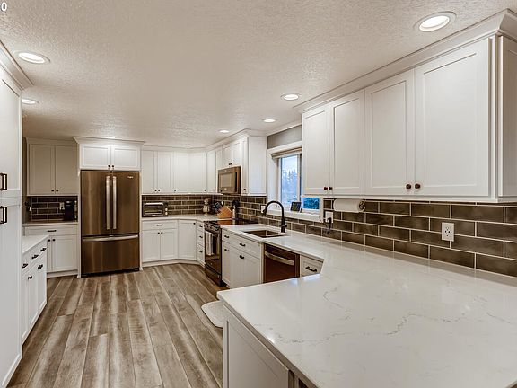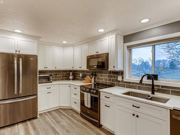 Two separate tax lots affording lots of opportunity. House is sitting on smaller lot 1.09 acres Larger lot (R065838) 3.8acres . Potential to build a new home. Must do due diligence with City/County.Wonderful remodeled home featuring incredible kitchen with great views over the pasture. Big bedrooms and great remodeled bathrooms. All the major work is done, newer vinyl windows bring light in throughout the house. Large lower level familyroom with huge stone fireplace.