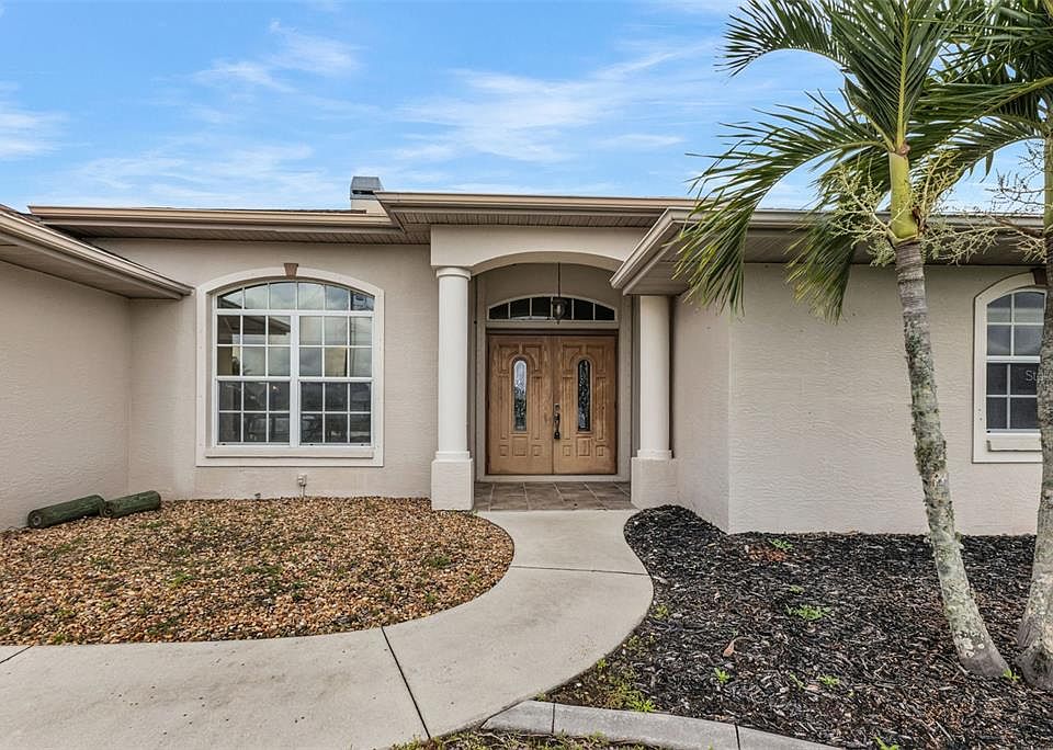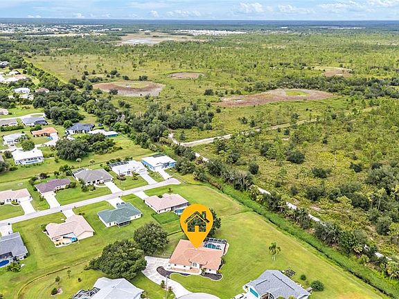 Welcome to this stunning custom-built home tucked away on a quiet cul-de-sac in Deep Creek, offering the ultimate in privacy and comfort. Sitting on two lots and backing up to a peaceful preserve, this property combines elegance, functionality, and Florida lifestyle all in one. Inside, you’ll find Italian tile with marble inlay, laminate-wood floors, tray ceilings, crown molding, and superb craftsmanship throughout. The open floor plan features a fireplace, surround sound speakers, and upgraded appliances with Corian counters and wood cabinetry in the kitchen. An office/game room with built-in cabinets provides versatility and could easily serve as a fourth bedroom. Step outside and enjoy your own private oasis with a heated pool and spa featuring a built-in table and plenty of space to entertain, a long circular driveway leading to an oversized side-entry garage with a workshop bump-out. Let your imagination run wild as this home is a blank slate for the landscaping enthusiasts! Roof 2023, HVAC 2022 Located in the desirable Deep Creek community, you’re just minutes from I-75, shopping, dining, golf, and everything Punta Gorda has to offer.