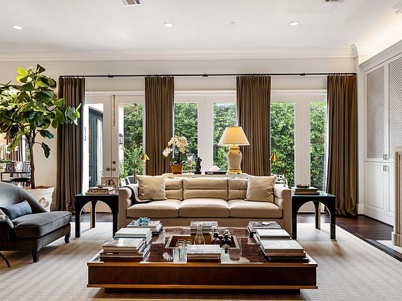 Transitional brick home with slurry finish built by Dorsey Custom Homes. Airy rooms w/ walnut wood flooring; soaring ceilings; gas-log limestone fireplace, full length & casement windows; soapstone and marble countertops in kitchen & baths. Light-filled living rm adjoins spacious kitchen & elegant dining room for entertaining ease. Kitchen w/ built-in Sub-Zero ref, frzr, warming drawer and walk in pantry. Spacious primary w/ 2 custom-fitted walk-in closets; marble bath w/ glass-enclosed shower, separate sink cabinets, water closet. En suite bedrooms w/ custom closets, marble/porcelain tile baths. Romantic outdoor terrace w/ multiple gathering areas and faux turf.