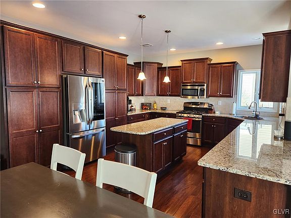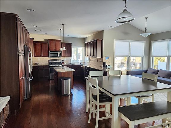 One of the Nicest homes in desirable Eagles Landing, Nazareth Schools. This home is Gorgeous! 9' ceilings. The first floor has a large formal dining room with beautiful millwork and is open to the formal living room. 1/2 bath off of the 1st floor den or office that would be great for a guest bedroom. Large 2 story family room with fireplace. Open kitchen with expansive 42" cabinets, dual pantries and large island. Great for those parties. Breakfast nook PLUS a sunroom. Upstairs has a 2nd floor laundry and 4 bedrooms. The master suite is one of the largest bedroom designs in the area with a sitting area and tray ceiling. Large master closet. The master bathroom is newly remodeled with tile heated floors, heated towels rack, dual sinks and modern large walk in shower with body jets. Lower level is ready for your finishing touches and is plumbed for future bathroom. In the yard you'll find an entertainers dream included a large covered patio with built in stone bar overlooking the new inground 14x28 heated salt water pool. There's over 100k in recent upgrades. Come see this home for yourself. You'll fall in love!