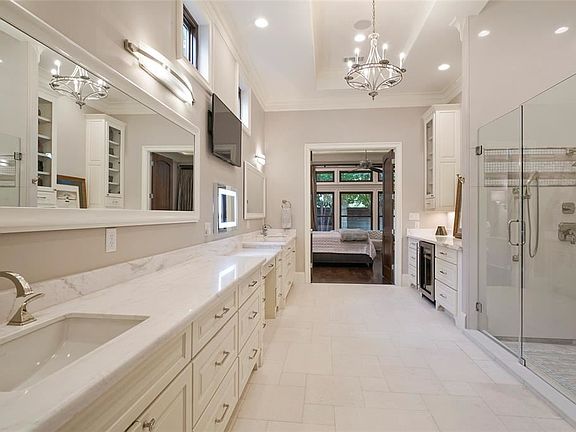 State of the art custom designed home in River Oaks Area! Exceptional features include Versailles pattern tumbled limestone floors and Milgard sliding door system opens living room wall to outdoor loggia/pool and summer kitchen. Bertazzoni stainless appliances in kitchen. Downstairs expansive master suite boasts transom windows with remote controlled curtains and lavish bath where custom details abound. Library upstairs is enhanced by wall of lighted shelves with rolling ladder and private balcony overlooking the pool and backyard. Utility rooms on both levels. Additional master suite on the second floor has an impressive bath with claw-footed soaking tub and expansive vanity. Serene resort style backyard accented with water features, heated pool/spa, rock paneled wall, outdoor kitchen, covered loggia, and additional green space.