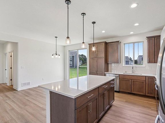This spacious split-bedroom new ranch home for sale in East Troy offers a comfortable and open floor plan. The heart of the home is the kitchen, featuring ample maple cabinetry, a generous pantry cabinet, and a large island that doubles as a snack bar, which is perfect for cooking and casual dining. The adjoining dining area and gathering room create a welcoming space for entertaining guests.For added convenience, the secondary bedrooms and hall bath are located on one side of the home, while the primary bedroom enjoys a private retreat on the opposite end. The primary suite includes a large walk-in closet and a spa-like bathroom with dual vanity and a spacious five-foot shower. A mudroom with plenty of storage, including a closet and bench, completes this functional and stylish home.