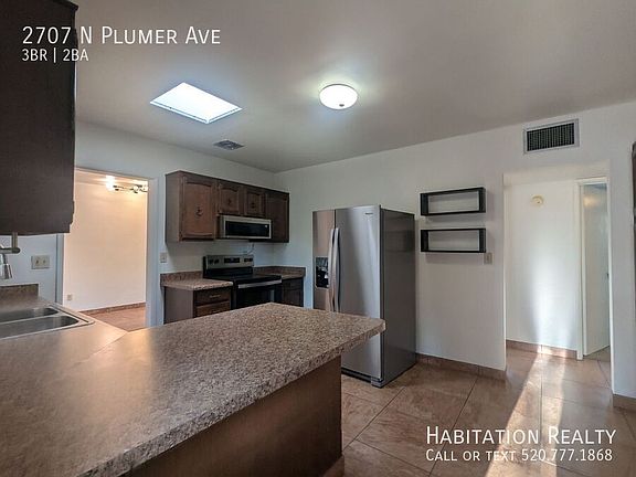 This 1950's home has been recently remodeled, but retains much of its mid-century glow. The kitchen features stainless steel appliances and a breakfast nook with plenty of fine cabinetry. The living room is very spacious with built-in shelving, and tile floors, along with an office/den peeking in the back. The huge back yard is perfect for relaxing and entertaining, with a covered patio and a storage shed! Nestled in one of Tucson's most desirable central corridors, 2707 N Plumer Ave offers the perfect blend of charm, convenience, and community. Located in the sought-after Campbell-Grant area, this neighborhood is prized for its mid-century architecture, walkable streets, and vibrant lifestyle. Just minutes from the University of Arizona and the Campbell Corridor, downtown, parks, shopping, and dining, the home sits in a highly accessible area with strong transit options!