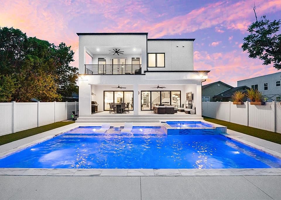 A home of rare presence and purpose, 2707 Ridgewood Avenue blends refined architecture with effortless livability in one of Tampa’s most established neighborhoods. Completed in 2023 by NEO, this five-bedroom, four-and-a-half-bathroom residence is defined by clean lines, intentional flow, and beautifully curated materials. From the moment you enter, natural light pours through oversized windows, setting the tone for airy, open-concept living. Wide-plank engineered hardwood floors guide you through soaring spaces that feel both expansive and grounded. The kitchen—centered around an oversized island—is outfitted with high-performance appliances including a gas cooktop, wine refrigerator, and tankless water heater, with custom cabinetry and stone surfaces throughout. The great room opens through sliding doors to a private outdoor retreat. A heated saltwater pool and spa are surrounded by covered lounge areas, a built-in grill, and Florida-friendly landscaping with irrigation, all enclosed by privacy fencing, turf lawn. It’s a seamless extension of the home—designed for entertaining, built for quiet moments. Upstairs, the primary suite offers spa-like comfort, complete with soaking tub, glass shower, dual vanities, and a custom walk-in closet. French doors open onto the balcony overlooking the city. Three additional bedrooms are generously sized, each offering en suite bathrooms with built-in closets. A full-size laundry room is conveniently located on the second floor. The fifth bedroom, located on the main level, is ideal for guests, den-office-study or multi-generational living. Additional features include a two-car attached garage, touchless entry, security lighting, water softener system, and energy-efficient climate control. Built on a stem wall foundation in Flood Zone X, the home qualifies for hurricane insurance deductions and offers long-term peace of mind. Ideally located just minutes from Tampa’s Riverwalk, Armature Works, and Downtown, this property offers sophistication, flexibility, and a lifestyle rooted in both design and location.