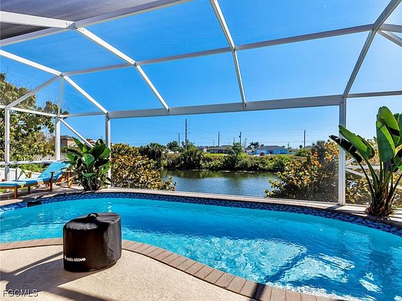 Situated along a waterfront canal, this impressive 4-bedroom, 2-bath saltwater pool home is move-in ready. The residence features an open, bright layout with vaulted ceilings, new flooring throughout the main living areas, and tile in the bathrooms. Bedrooms are split for privacy, and both bathrooms have been updated. The open floor plan provides ample space for gatherings and family activities. The kitchen includes granite countertops, a center island with designer pendant lighting, newer Samsung stainless steel appliances, and overhead LED lighting to accommodate culinary enthusiasts. Outside, a landscaped tropical setting offers mature avocado, mango, and banana trees. The spacious lanai and "picture frame" screen at the water’s edge create a tranquil environment beside the heated saltwater pool, which features an auto-pilot system for low-maintenance upkeep. This outdoor area is ideal for entertaining and is pre-wired for an outdoor television and kitchen. Additional amenities include lush landscaping with a privacy fence and 80 feet of waterfront views as well as an outdoor shower. Recent updates include a new metal roof (2023), new water heater (2022), new outdoor fence (2023), a fully updated well system (2022), and seamless gutters around the entire house. The property is equipped with a whole-house water softener and filtration system (replaced in 2022), storm protection shutters, Fabric-Tech Storm Smart electric shutters poolside, and a garage with built-in sink, countertops, cabinets, an additional stove, refrigerator, and Tesla/RV charging station. Home automation allows for app control of the A/C, alarm, and lighting systems. This home is ready for immediate occupancy. You are now HOME!