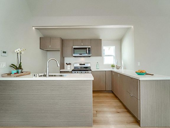 Features: The kitchen comes equipped with a stainless-steel stove, microwave, refrigerator, and dishwasher.