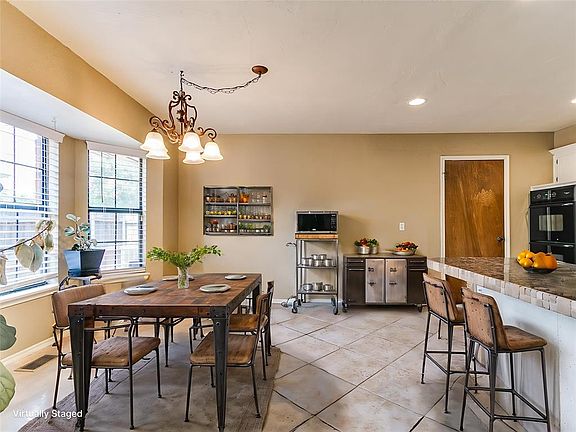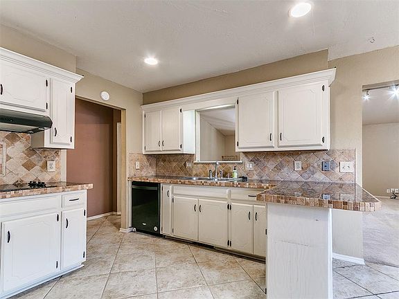 Spacious yardThree bedroomsOversized kitchenTile counter topsBeamed ceilingLots of counter spaceWhite bookcases