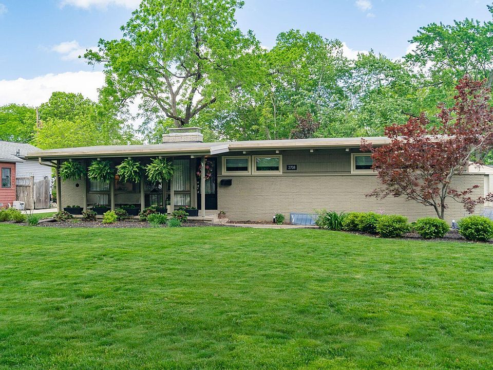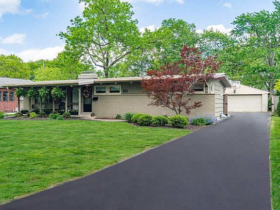 Immaculate mid-century modern ranch in the heart of Upper Arlington features open concept with exposed beam ceilings. Large, floor to ceiling windows flood the great room with natural light and show off the brick fireplace & beautiful hardwood floors. Spacious dining area with new chandelier opens to a bright kitchen space updated with stainless steel appliances (including gas range), glass tile backsplash, and quartz counters. Primary Bedroom with double closet features a private bath with tiled shower. Two bedrooms with wood floors share the hall bathroom recently updated with new tub/shower. Lower level finished space adds almost 700 sq ft with dry bar and rec room, perfect for entertaining. Extra room for kids play or crafting! A private office/den with french doors makes it easy to work from home. Plenty of clean storage in the unfinished half of the basement. Covered, new paver back patio with knee wall is a fun spot to watch football and cookout! Complete brand new driveway leads to an oversized 2 car detached garage. Mature landscaping & fenced backyard! Ideal location--walk/bike to Lane Avenue shops & restaurants, Upper Arlington High School, Kingsdale, Community Center and much more!