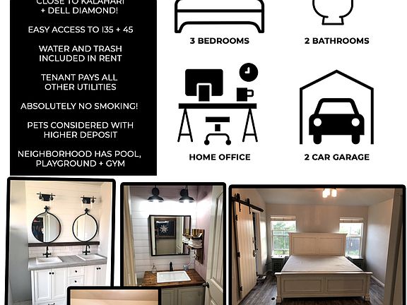 1508 sq ft 3 bed 2 bath, with office. 2 car garage Completely remodeled within last few years Close to Kalahari and Dell Diamond. Easy access to 35 and 45. Tenants pays all utilities, except water and trash included (up to $100, tenant pays anything over) Renters insurance required Absolutely no smoking Pets considered, with higher deposit Neighborhood has playground and pool access Tenants pays all utilities, except water and trash included (up to $100, tenant pays anything over) Renters insurance required. List us as additional interest Absolutely no smoking Pets considered, with higher deposit Current French door refrigerator will stay in the house but typically fridge is not included