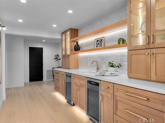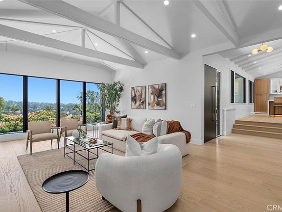 Welcome to this exquisitely remodeled residence nestled on one of Upper Malaga Cove’s most prestigious cul-de-sac streets, where refined design meets the quintessential Palos Verdes lifestyle. Perched gracefully above the road, the home is introduced by an expansive brick patio that showcases views of the coastline, city lights, and tranquil ocean horizons—a perfect vantage point for morning coffee or sunset gatherings. The exterior is graced with timeless PV stone details that blend beautifully with the surrounding architecture. Step inside to discover European oak floors flowing throughout the main living spaces, lending a warm yet modern ambiance. Vaulted ceilings in both the living room and kitchen enhance the sense of volume and light, creating an open, airy environment ideal for entertaining and everyday living. In the living room, a dramatic marble slab fireplace creates an elegant focal point, framed by thoughtfully curated lighting that elevates every corner. The kitchen is a showcase of custom craftsmanship, featuring white oak shaker cabinetry with glass-front doors illuminated by integrated LED lighting. A custom-designed curved-edge hood anchors the space above quartz slab waterfall edge countertops and backsplash, while the adjacent powder bath offers a statement floating marble vanity with an integrated marble sink—each detail meticulously envisioned and executed. Entertaining is effortless in the lower-level bar area, where white oak shaker cabinetry and floating shelves with under-shelf lighting create a welcoming environment for gatherings. Upstairs, the primary suite boasts beautiful coastline and city-light views that greet you each morning, a generous walk-in closet and a serene bathroom showcasing walls clad in large-format porcelain tiles, two sinks, a stand-alone soaking tub, and dramatic lighting—all contributing to the spa-like atmosphere. All bathrooms throughout the home are finished with decorator fixtures, and each tile selection was custom designed and curated to create a cohesive and sophisticated feel. On the lowest level is a thoughtfully designed guest suite with a private entrance and a spacious en-suite bathroom, perfect for visiting family or long-term guests. The upper backyard offers a peaceful grassy retreat with sweeping coastline, ocean, and city views, completing this exceptional offering. This is a rare opportunity to own a turn-key, design-forward property in one of Palos Verdes’ most coveted enclaves.