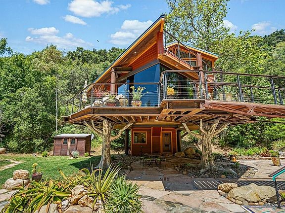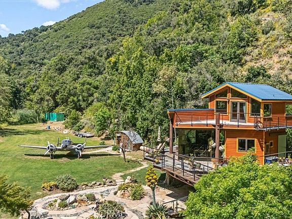 Welcome to your secluded haven, a breathtaking 25-acre retreat nestled in the heart of nature's splendor. Located at the backside of Lopez Lake, nestled in a beautiful canyon one can find this extraordinary property that offers a rare opportunity for privacy and tranquility. Enjoy unparalleled privacy and serenity with no immediate neighbors. The natural landscape ensures that you can unwind and rejuvenate away from the hustle and bustle of city life. The residence is a harmonious blend of rustic charm and modern comforts, thoughtfully designed to complement the surrounding environment. Often referred to as the ultimate "tree house" the residence itself sits upon large metal tree stumps hand painted by a Disney artist. Step inside and be amazed with the level of construction detail and uncommon materials used. The floors are made of Walnut burl wood cross sections tied together with veins of composite resin & marble. The stairway is made from Olive wood, mahogany and stainless steel railing. Two Mexican copper bowls sunk into a burlwood vanity catch your eye as you enter the bathroom where the walls of glass open for an al fresco shower experience should you desire. At only 950sf, this private retreat was clearly built with a "no restrictions on imagination". Wanna have your guests come stay the night? There is a 1953 Beach Craft 18 in the meadow that has been converted into an amazing sleeping quarters.