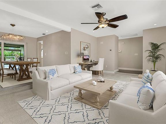 A true Floridan Oasis, this completely move-in-ready Gulf accessible home has been totally transformed and meticulously renovated. Nestled on one of the largest canals within all of Bonita Springs, boaters will enjoy a new composite dock equipped with electricity and water, a 10,000 lb. boat lift, fish cleaning station, and a new sea wall replacement in 2018. Enjoy a sought after Western sunset capturing breathtaking sunsets from your picture window screen cage and custom saltwater pool with surrounding marble tile. Live in peace knowing that your home is totally storm protected with all hurricane rated impact windows and doors, roll-down rear hurricane screens, and a whole home gas generator. Additional features include a new roof installed in 2018, fenced in yard, air conditioned garage, new A/C system in 2022, new water heater in 2021, new pool heater and pump in 2022, and new plumbing, appliances, and electricity installed in 2023. Tucked away on a private road, this property boasts the advantage of no costly homeowner's association (HOA) and in ideal location surrounded by some of our area's finest restaurants, beaches, and shopping opportunities.