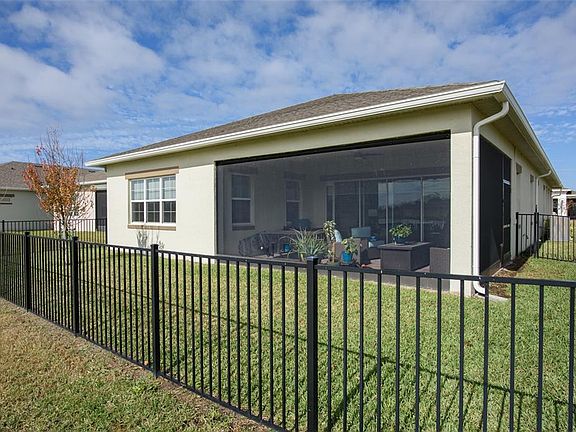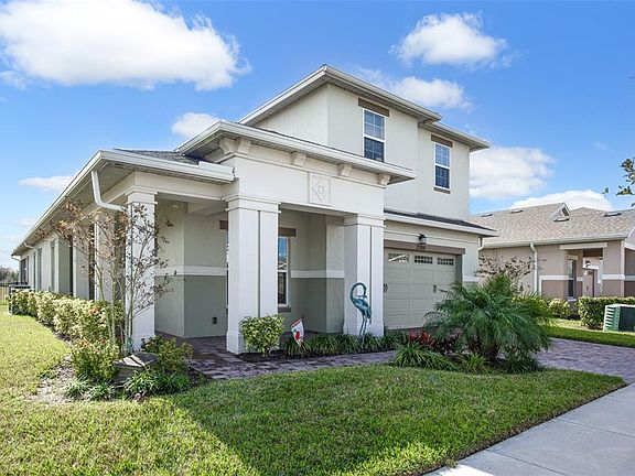 Beautiful 4 bedroom, 4 bathroom home in the highly sought after Twin Lakes 55+ Active lifestyle community. The Marco 2 is a two story beautiful home with a versatile floor plan. When you step inside, you will be greeted with 10 foot ceilings and upgraded ceramic tile throughout the home. As you enter the kitchen you will be greeted with an upgraded kitchen with stainless steel appliances, convection oven, gas stove, 42" upgraded cabinets, quartz countertops, glass tile backsplash, walk-in pantry and a 10 foot island with upgraded pendant lights that easily seats 6 people. The Living Room/Dining Room combo has upgraded light fixtures and recess lighting. The sliding glass doors that lead out to the screened porch, open all the way for the ultimate indoor/outdoor Florida living. Out on the screened porch you can sit and enjoy the view of the pond in the back while drinking your morning coffee. The master bedroom has a large walk-in shower with glass doors and a large walk-in closet with a newly installed closet organizing system. There are two more bedrooms on the first floor. Bedroom 2 includes a full bath and a walk-in closet. The 3rd full bath is in the hallway to also be used as a guest bathroom. Bedroom 3 is just down the hall with a nice size closet. Off Bedroom 3 you'll find the office area that is already piped for water if you would like to add a wet bar. The stairs lead up to the second floor where you will find the 4th bedroom and 4th bathroom. This flexible room is currently being used as the owner's media room and office. Amenities include a resort style pool and lap pool, 20,000 square foot Clubhouse, fitness center, tennis courts, putting green, walking trails, pickle ball court, fishing and pontoon boats to use on Live Oak Lake. The community has many active and socializing activities for residents to connect with each other. This versatile home could be a wonderful space for multiple family members or friends who wish to live together. Close to Lake Nona Medical City, Orlando International airport, Theme parks, beaches and downtown Orlando. This house is a must see.
