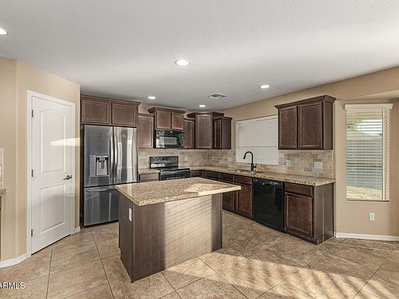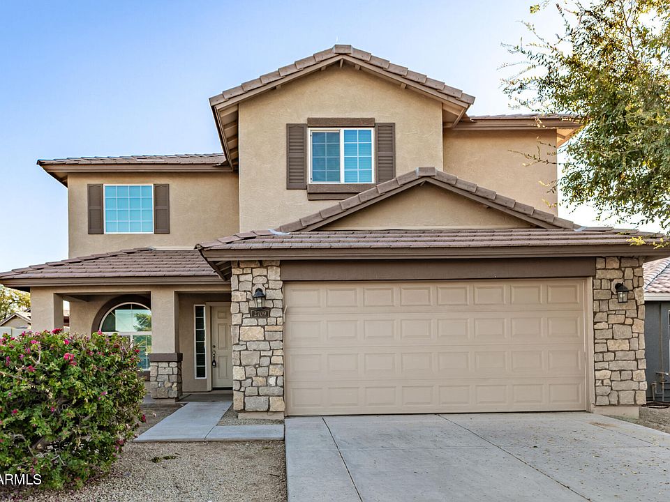 Welcome to this spacious and energy-efficient 5-bedroom, 3-bath home with fully paid-off solar panels. This 2-story property is located just minutes from the airport and downtown Phoenix, offering both convenience and comfort.The exterior features stone accents and a cozy front porch. Inside, the home includes tile flooring in high-traffic areas, soft carpet in the main living spaces, and a welcoming living/dining room. The bright great room has Arcadia doors that open to the backyard for easy indoor/outdoor living. The upgraded kitchen offers built-in appliances, recessed lighting, a pantry, granite countertops, a Travertine tile backsplash, a breakfast nook, a center island with a breakfast bar, and staggered wood cabinets with crown molding.