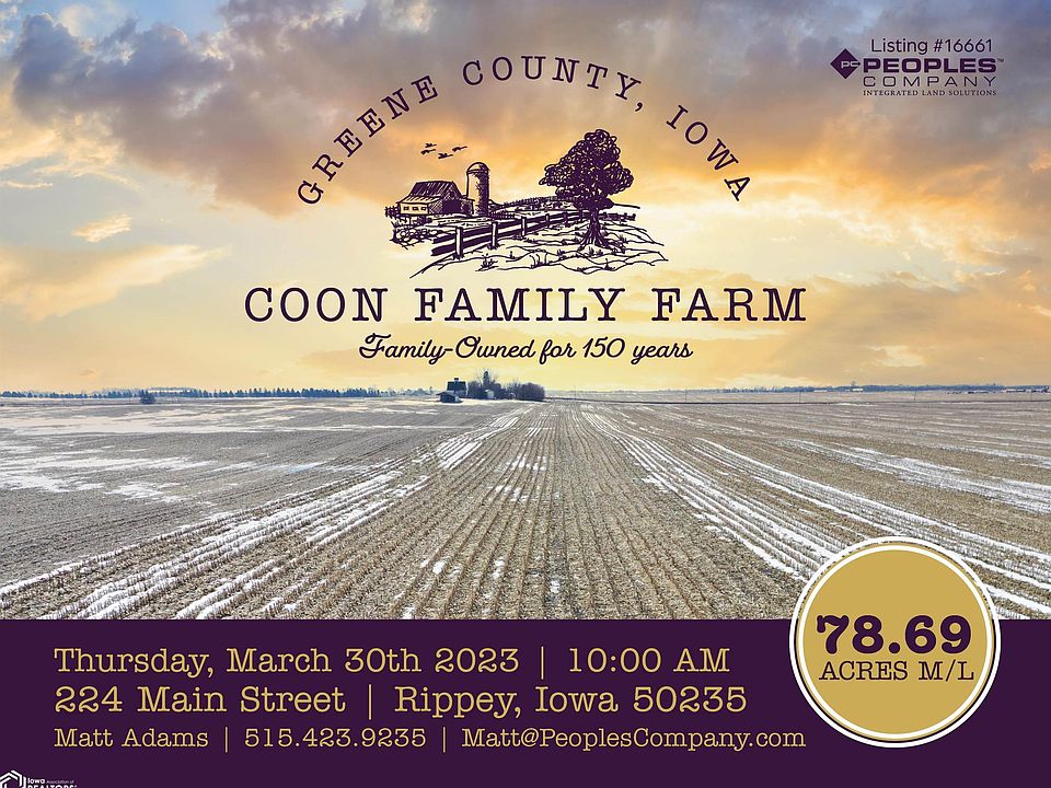 Greene County, Iowa Land Auction – Mark your calendar for Thursday, March 30th, 2023 at 10:00 AM! Peoples Company is representing the Eva Marie Coon Family in the sale of 78.69 acres m/l of prime Greene County, Iowa farmland. This family farm originated from the late Lewis Coon sometime in the early 1870’s and has provided for the family for more than four generations, or over 150 years earning the prestigious Heritage Farm status. This nearly 100% tillable farm consists of 75.11 FSA tillable acres with an above average CSR2 soil rating of 86.9. (The average CSR2 rating for Greene County is 78). The primary soil types on this tract include top-producing Canisteo, Nicollet, and Clarion loams. The farm is located four miles northwest of Rippey, Iowa, and five miles southwest of Grand Junction, Iowa on the northwest corner of the 270th Street and T Avenue intersection. Visit our website for more information regarding this Auction!