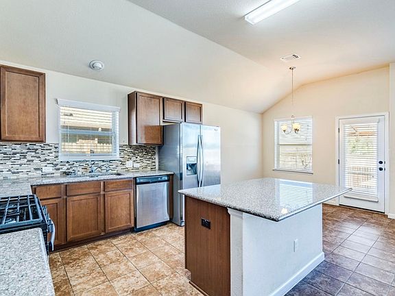 Well appointed one-story home nestled in StoneRidge community. The ornate, wooden front door leads you into a welcoming entryway that flows into the living, dining and kitchen areas. Several windows flood the open floor plan in natural light. The open kitchen offers granite counters, attractive mosaic backsplash and a large island that provides bonus seating, storage and power outlets. The secondary bedrooms and second full bath are located at the front of the home with wood flooring that adds the perfect amount of warmth. The primary retreat is tucked at the back of the home for added privacy. Also boasting wood floors, the primary bedroom also has en suite bath with dual vanity, oversized walk-in shower and spacious walk-in closet. Step out back to enjoy the covered patio. Pre-treated for termites for peace of mind. Zoned to Johnson High School. Come tour today!