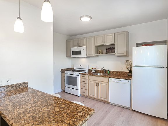 Peaceful, bright, spacious and tastefully updated +-800 sq ft one bedroom+ in a Victorian on 1/3 of an acre surrounded by lush landscaping at the foot of Christmas Tree Hill. New wide plank European white oak flooring, high ceilings, recessed lights, ceiling fan, and two outdoor decks are just some of the details that make this unit an exceptional place to call home. Private entrance through the large covered porch into the open floor plan living/dining/kitchen area. The bright living room features large windows with wide open views on 3 sides, peekaboo bay views, gardens, and wildlife. The large kitchen has custom granite countertops, hardwood cabinetry with ample storage, newer gas range with microwave vent hood, refrigerator, dishwasher, and granite dining bar. The bedroom has high ceilings with a modern ceiling fan. Off the bedroom is a multi-purpose room/office with glass doors that opens onto a second private deck. The exquisite bathroom has two newer marble sinks with cabinets, custom mirrors and lighting + marble tiled bath shower. On site shared laundry room. Parking for one car in a two-car garage. Extra locking storage space. The convenient location is close to cafes, restaurants, spas, shops, parks and transit center, as well as a very easy commute to 101 and minutes to world class hiking and biking trails on Mt Tam. No smoking or vaping. Quiet building. Lease term is for 11 and 3/4 months. Square footage is not verified. $40 for credit/criminal/eviction check and application. Inquire about additional costs for utilities.