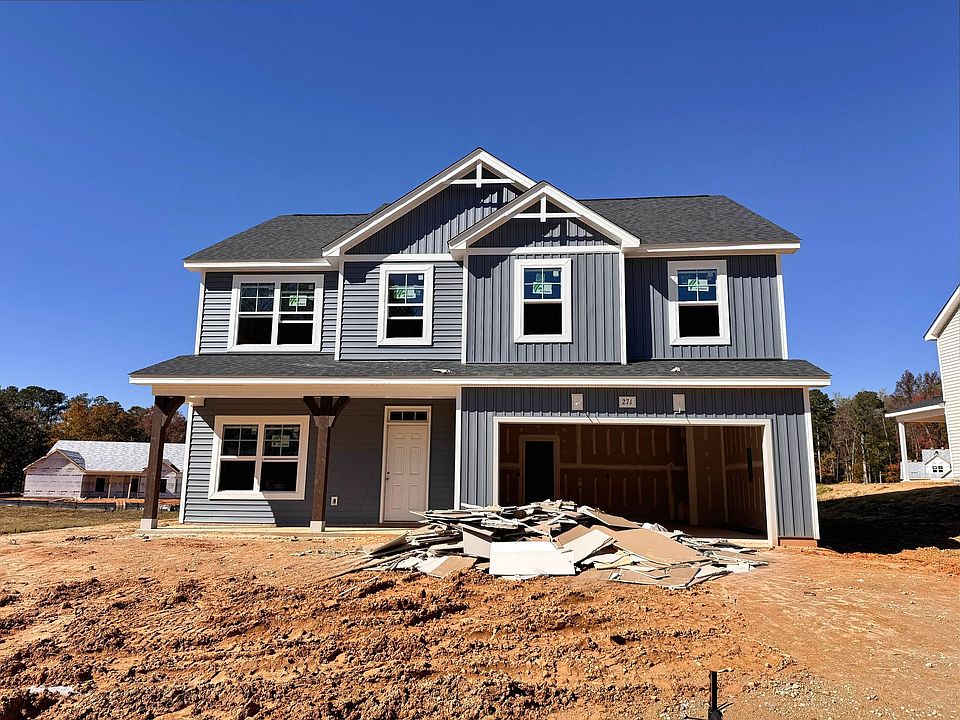 This home features a foyer with two-piece crown molding and wainscoting, with a dining room off the foyer, plus a coat closet and a convenient half-bath. The open great room features an electric fireplace with black granite surround and opens to the kitchen with a large island, "Azul Platino" granite countertops, white shaker cabinets, corner pantry, white subway tile backsplash, and stainless steel appliances including a microwave, dishwasher, and smooth-top range. The breakfast area leads to the covered rear porch. Upstairs, an open loft area provides additional living space, with a nearby linen closet and laundry room. The second-floor primary suite features a cozy sitting area and a bathroom containing a white dual sink vanity with a "Niagara" quartz countertop, garden tub, walk-in shower, and spacious walk-in closet. Three additional bedrooms and a full hall bathroom complete the second floor. Exterior highlights include low-maintenance vinyl siding with board and batten accents, dimensional roof shingles, a spacious front porch, and an SW "Pineapple Cream" front door with smart keypad entry to the home. This home includes a 2-car garage, fiber optic internet service availability, Energy Plus certification, and a 1-2-10 builder in-house warranty. Long Point Reserve combines small-town charm with modern convenience, offering amenities such as a swimming pool, pool house, proposed dog park, and easy access to Southern Pines, Fort Bragg, and Raleigh. *Built by Cates...