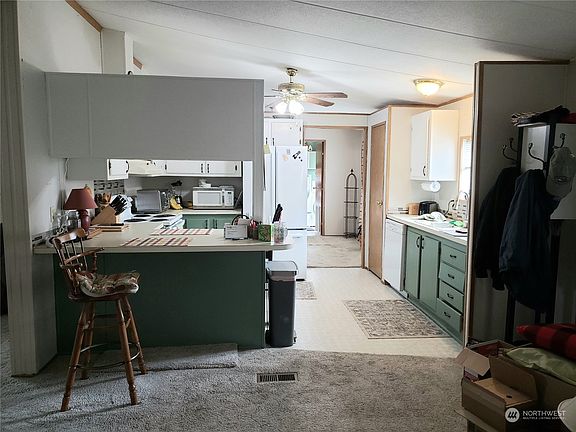 Rare Opportunity! Nice Huge 1848 Sq Ft 4 Bedroom 2 Bath Home in Enumclaw. Vinyl Siding and Skirting. Large Open Bright Kitchen with Painted Cabinets, Pantry, All Appliances and Breakfast Bar. Huge Living Room and Formal Dining Room Area. Spacious Second Living Room off Kitchen. New Carpet and Cathedral Ceilings Through Out the Home. Enormous Primary Master Bedroom & Full Bathroom Jetted Soaking Tub, Newer Vanity and Toilet. All Very Large other Bedrooms. Brand New Main Guest Bath with New Vanity, Toilet, and New Flooring. Newer Windows Through Out.Care Free Vinyl Siding. Separate Utility room With Storage Cabinets. Dry Storage Shed. New Fully Fenced Pet Friendly Backyard With Brick Patio and Flower Bed Area. 2 Vehicle Parking & Carport Area