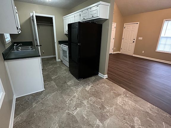 Freshly updated 3-bedroom, 2-bathroom home with vaulted ceilings, modern finishes, and a spacious interior. This single-story ranch features LVP flooring throughout, neutral paint tones, and abundant natural light. The kitchen includes white cabinetry, a black refrigerator, and a white electric stove. Washer hookup is available in the utility area. Both bathrooms offer full tub/shower combinations with clean, functional layouts. The home sits on a sloped lot in a quiet, established neighborhood with driveway parking and easy access to schools, parks, and local amenities. Move-in ready and well-maintained by attentive owner.