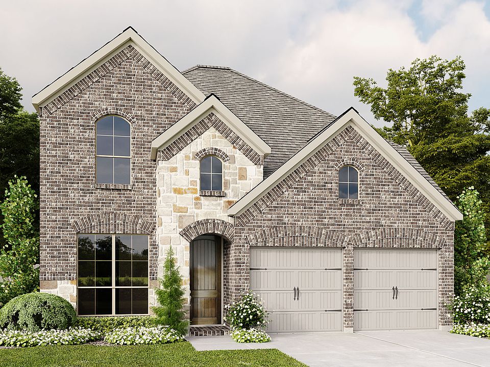 Guest suite set at two-story entry. Two-story family room opens to kitchen and morning area. Kitchen features large walk-in pantry, 5-burner gas cooktop and generous island with built-in seating space. Family room features wall of windows. First-floor primary suite includes bedroom with a wall of windows. Dual sinks, garden tub, separate glass-enclosed shower and large walk-in closet in primary bath. Game room and all secondary bedrooms are upstairs. Extended covered backyard patio and a 7-zone sprinkler system. Two-car garage. Representative Images. Features and specifications may vary by community.