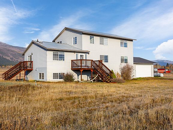Located on the Westside with spectacular 360-degree views of the Bitterroot and Sapphire Mountain ranges. This one-owner home boasts 2560 square feet of living space on 19.24 irrigated acres and no known covenants. As you step inside, you'll be greeted by a spacious and airy atmosphere There's lots of natural light and windows to see the mountain views. The home features four ample-sized bedrooms and two full bathrooms, ensuring privacy and convenience for all occupants. Some features include a breakfast nook, kitchen bar, vaulted ceilings, dining room, office area, sitting room and full basement. The upper-level primary suite is a private retreat with a jetted soaking tub and balcony. The full basement has room for a pool table, game room, or close the door and have privacy between levels. It's the perfect mix of country and convenience. Just a short 5-minute drive to Hamilton. Call Sue Justus 406-360-9799 or your real estate professional
