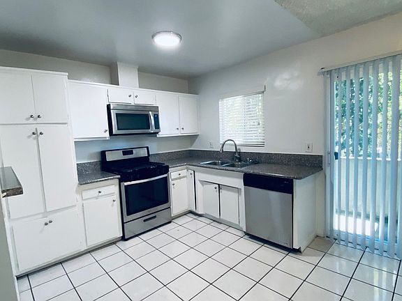Equipped with tile flooring, granite countertops, and stainless steel appliances including a gas stove/oven, over-the-range microwave, and dishwasher. Also includes a new stainless steel sink with tall spout faucet, bar area overlooking the living room, new bladeless ceiling fan with a dual dimmer switch, ample cabinet space, and a large sliding glass door opening to your private balcony.